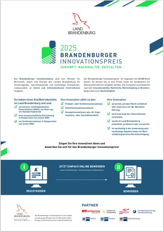 Bis zum 28.03.2025 um 12 Uhr können Unternehmen einzelne Projekte, aber auch Projekte, die in Kooperation mit wissenschaftlichen Einrichtungen entstanden sind, einreichen. Vor allem kleinen und mittleren Unternehmen (KMU), Handwerksbetrieben und Start-ups soll mit dem Brandenburger Innovationspreis eine öffentlichkeitswirksame Präsentation ihrer Innovationen ermöglicht werden. Der Brandenburger Innovationspreis ist mit insgesamt 30.000 Euro Preisgeld dotiert.