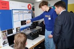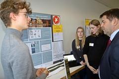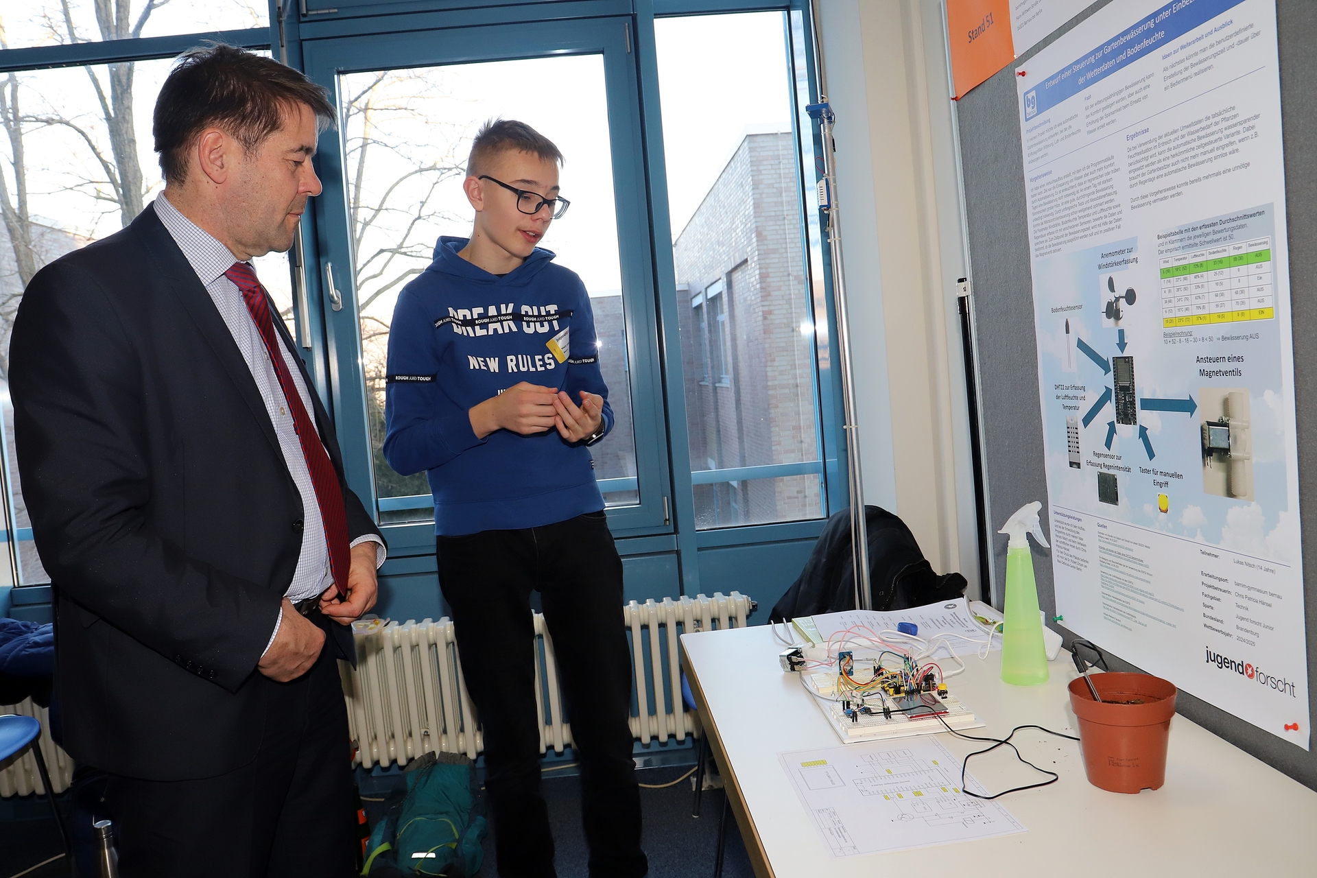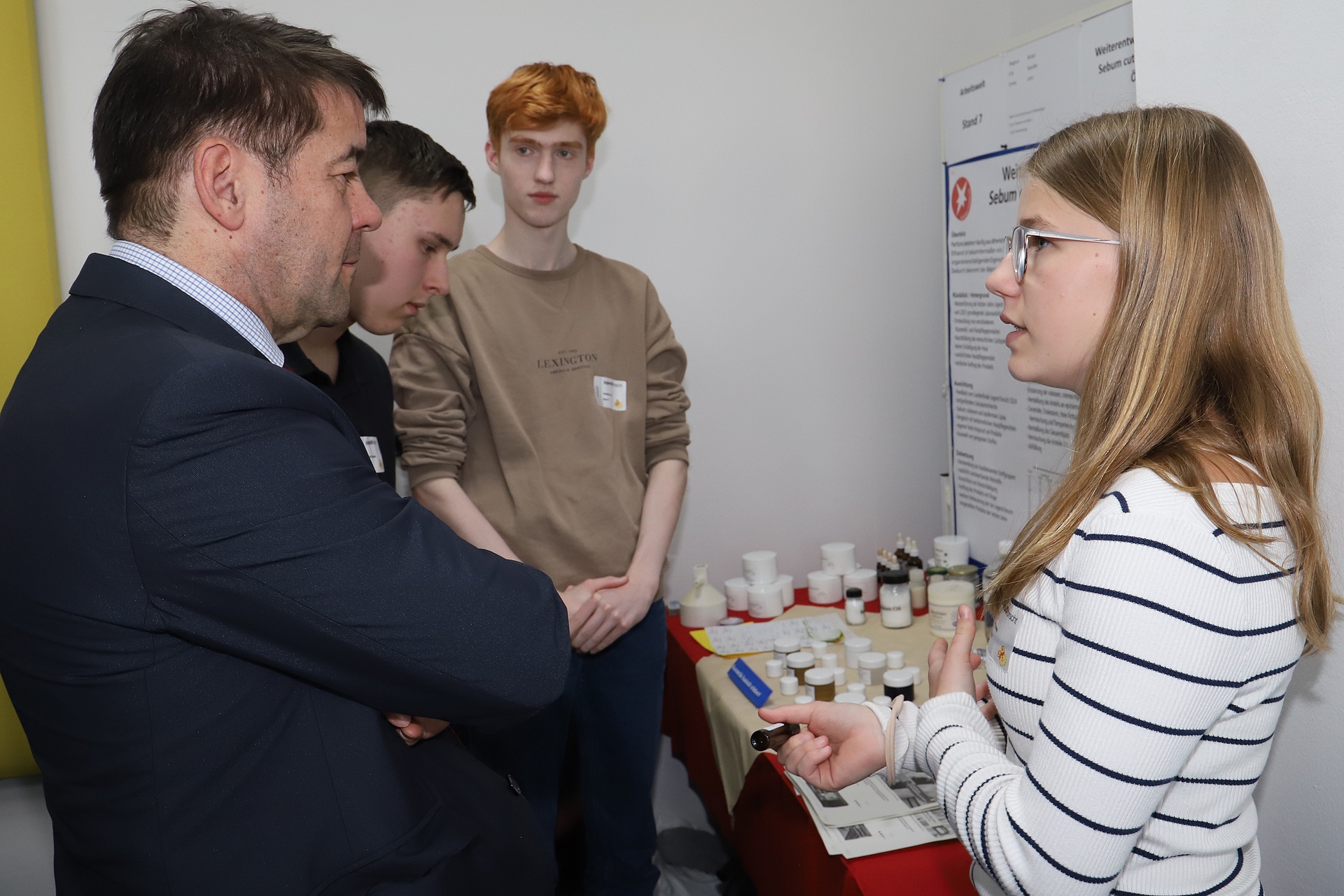Oberbürgermeister Steffen Scheller ließ sich von den jungen Forschenden ihre Ideen erläutern. Besonders beeindruckt zeigte er sich von einer Gartenbewässerungssteuerung, die sich automatisch an das Wetter anpasst, sowie von antibakteriellen Hautcremes und Parfüms. Am Stand von ZF erfuhr er, dass die neue Erfindung nicht nur Zeit und Platz spart, sondern auch wartungsfreundlich ist. Weitere Projekte reichten von digitalen Dolmetschern für Gebärdensprache über Forschung zur Veränderung der Polkappen auf dem Mars bis hin zu sicheren Übertragungsmethoden für in Klänge umgewandelte Sprachnachrichten.