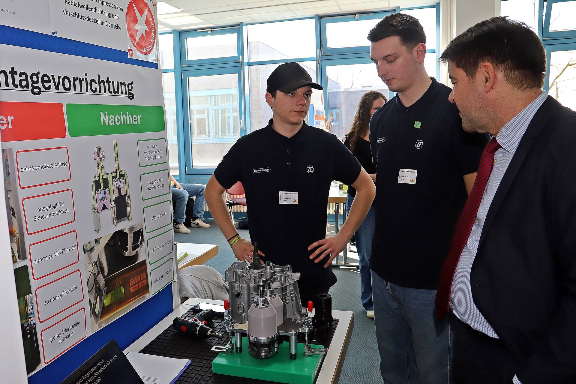 Von intelligenten Maschinen über klimafreundliche Technologien bis hin zu kreativen Alltagserleichterungen – die Bandbreite der Projekte ist beeindruckend. Auch Beiträge aus der Havelstadt waren dabei. Das Team von Heidelberger Druck, bestehend aus Aurelius Teschendorf, Ben Schröter und Florian Menz, stellte ihr „Intelligent Air Valve System“ vor. Die ZF-Auszubildenden Tim Wiegandt und Kandy Steinert entwickelten eine Vorrichtung zum Einpressen von Radialwellendichtringen und Verschlussdeckeln in Getrieben – ein Projekt, das ihnen die Qualifikation zum Landeswettbewerb sicherte.