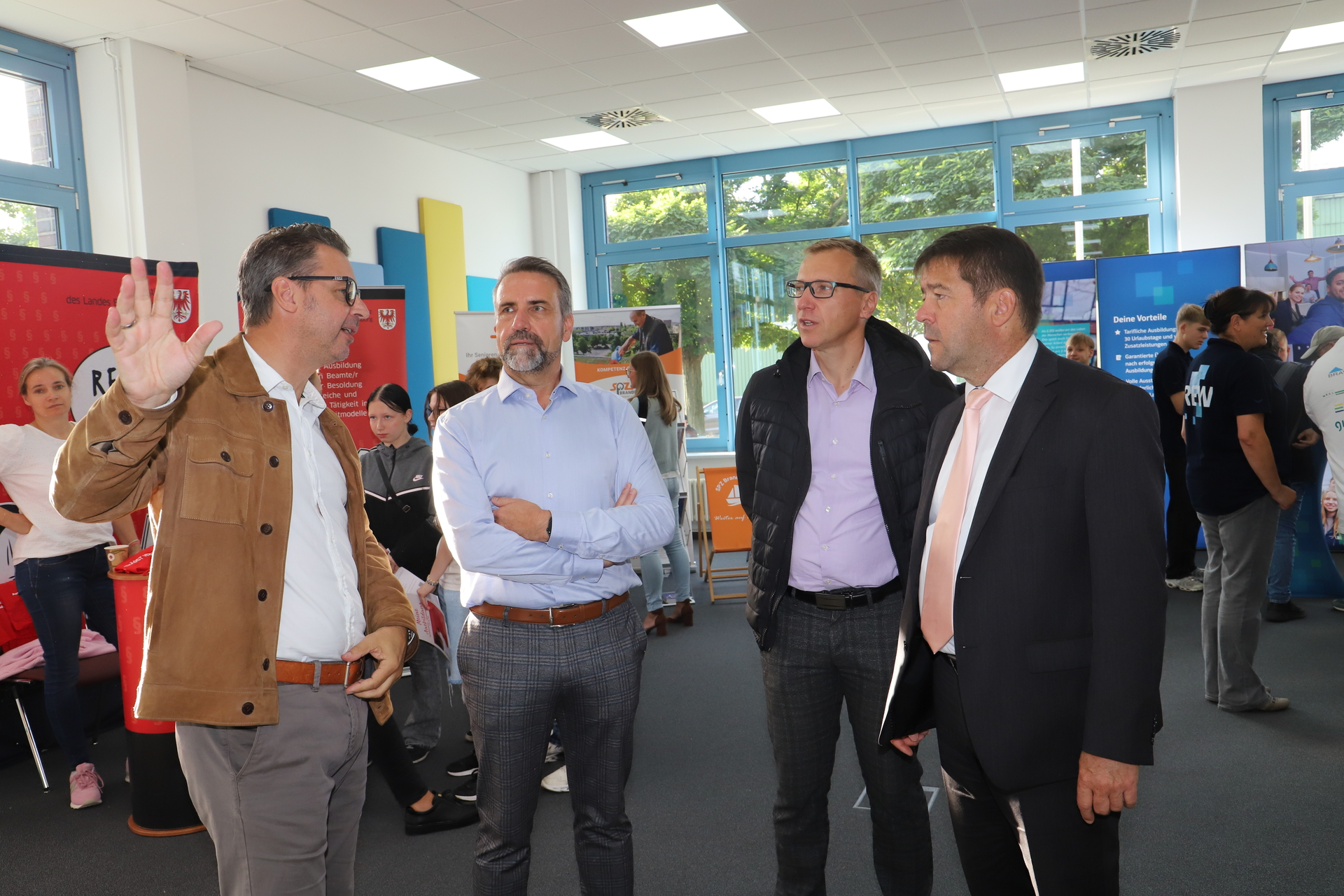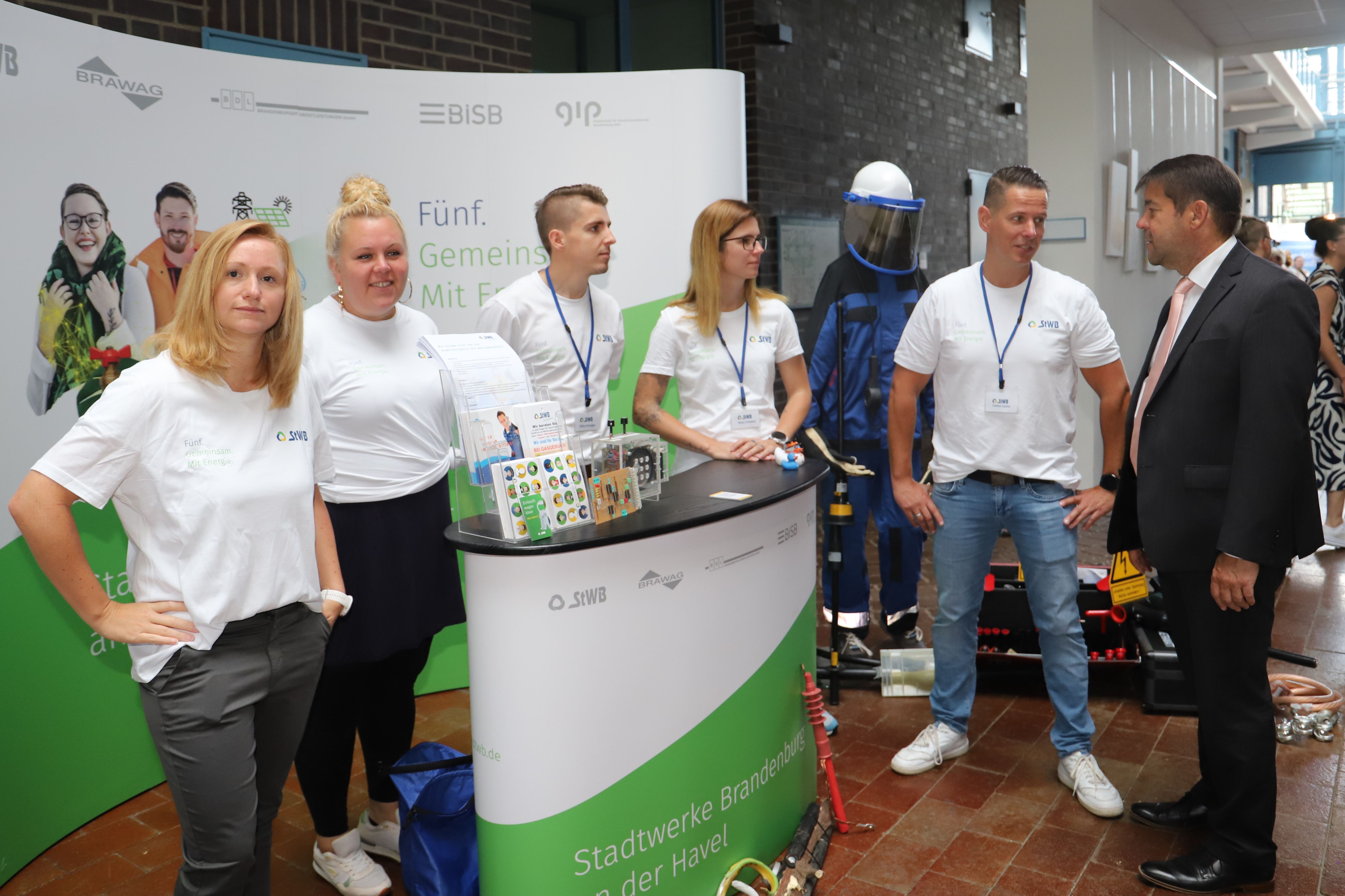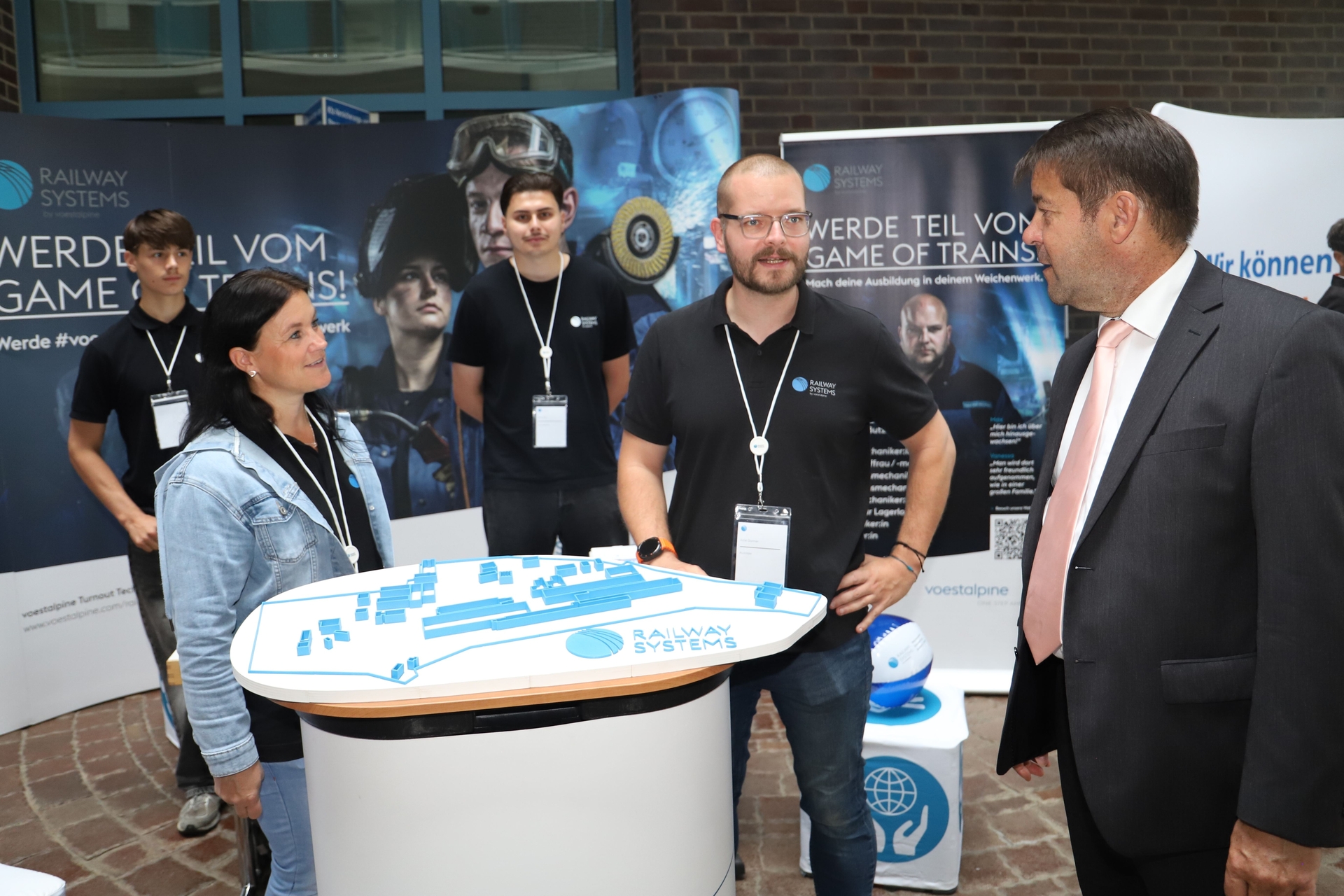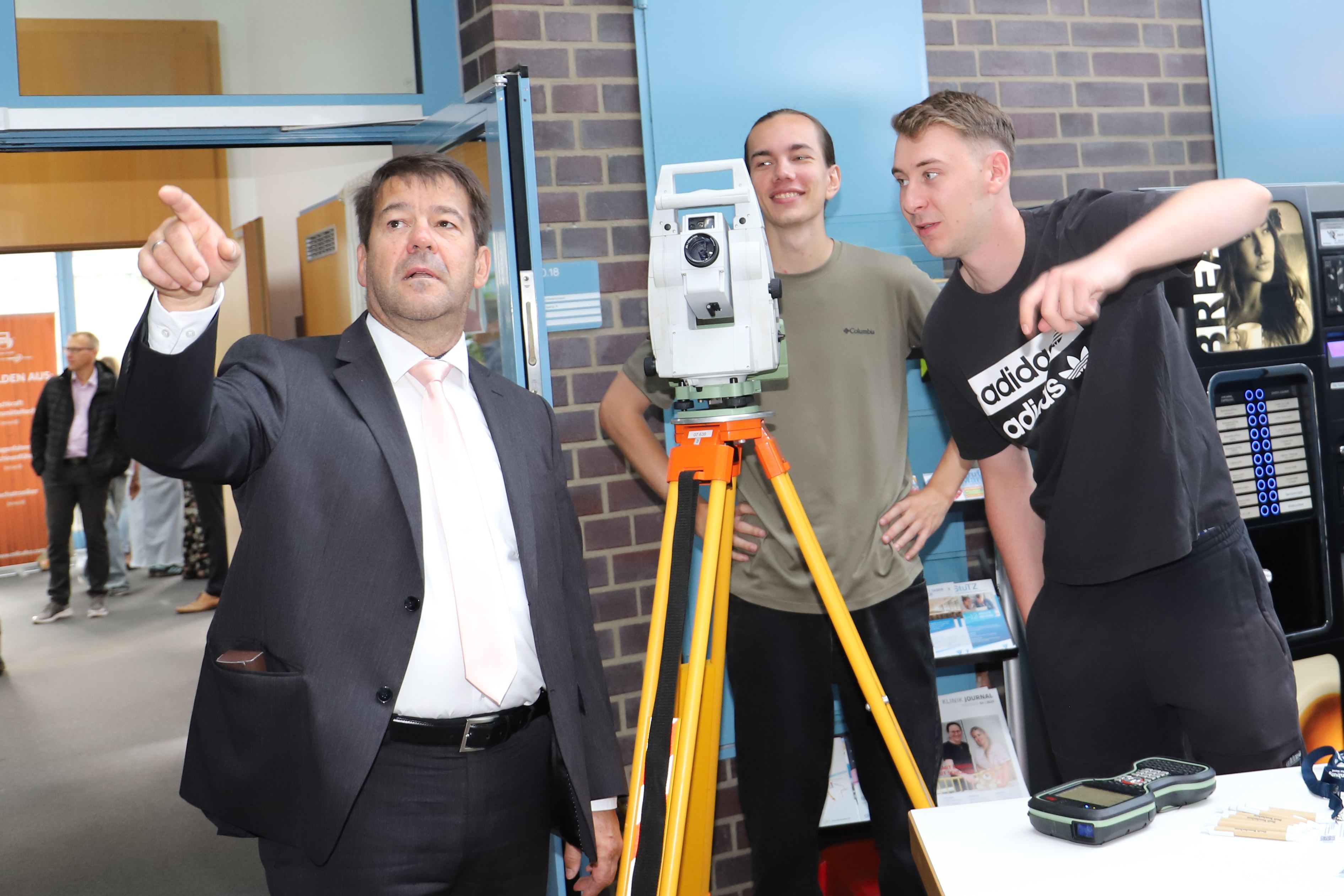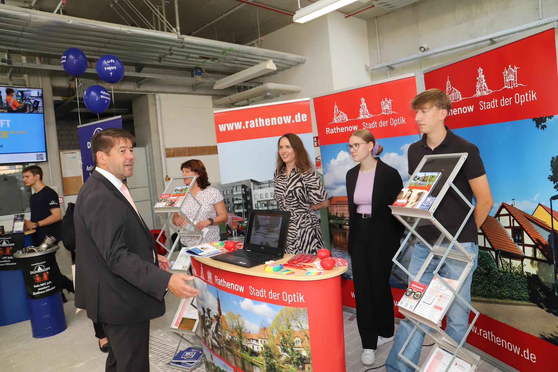 Im Anschluss besuchten die Vertreterinnen und Vertreter aus Politik und Verwaltung die Stände. Steffen Scheller ließ sich dabei nicht nur Berufe erklären, sondern probierte auch selbst aus: So erfuhr er bei Metallbau Windeck, wie Explosionszeichnungen funktionieren, und testete bei den Vermessern seine Schätzfähigkeiten zur Entfernungsmessung. Am Stand von ZF ließ er sich ein Getriebe erklären, das in einem Sportwagen zum Einsatz kommt. Interessante Einblicke zu Ausbildungsmöglichkeiten gewann er auch bei einer Steuerkanzlei und der Brandenburger Polizei.