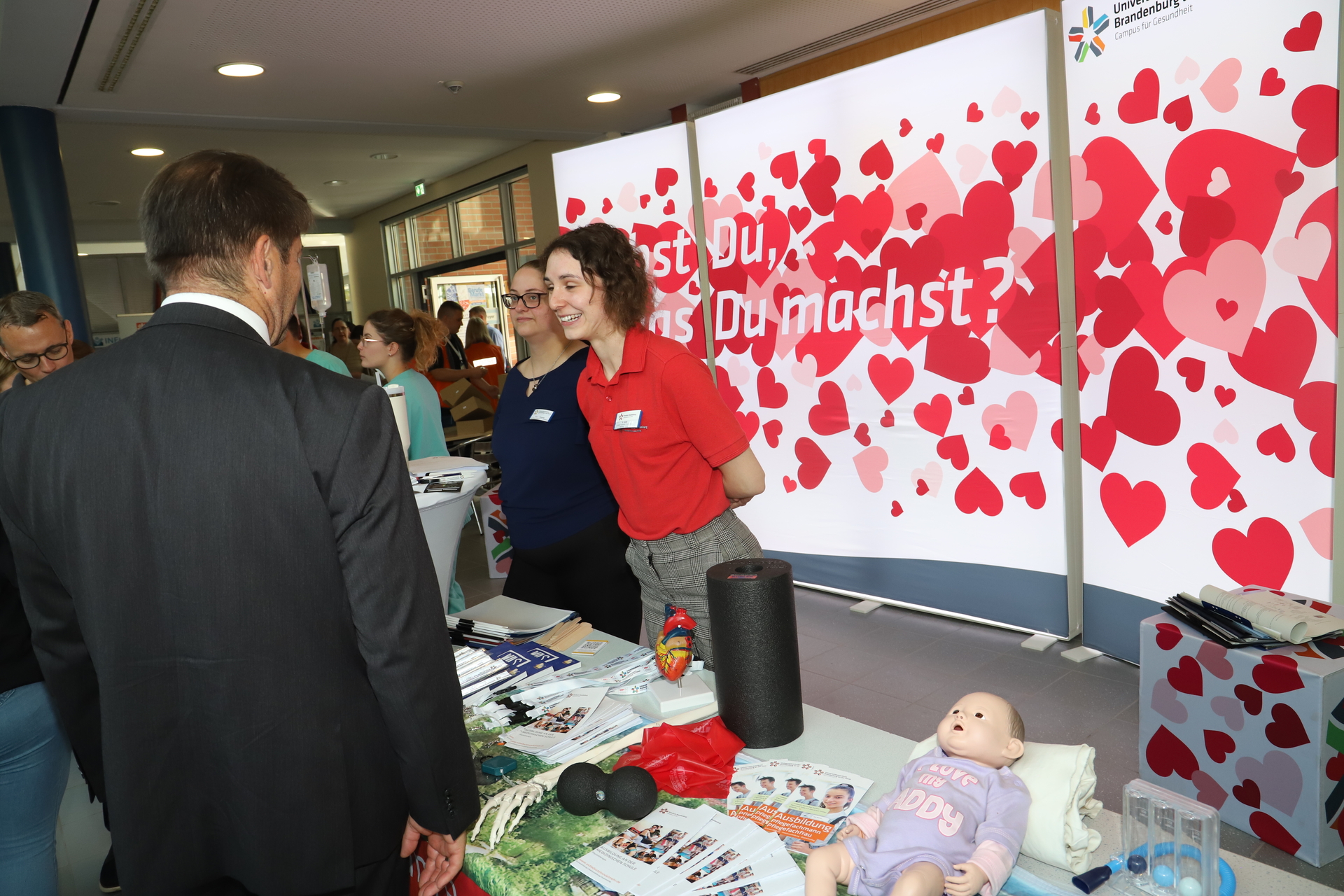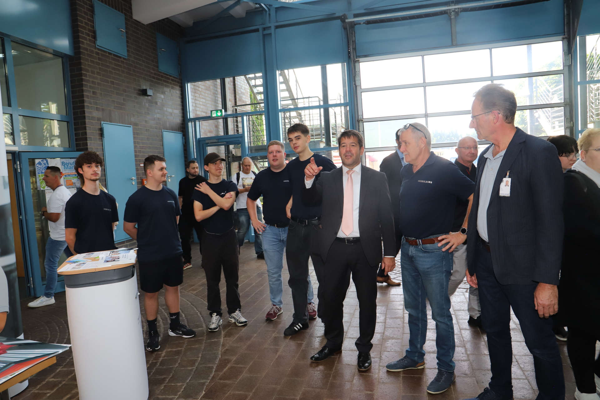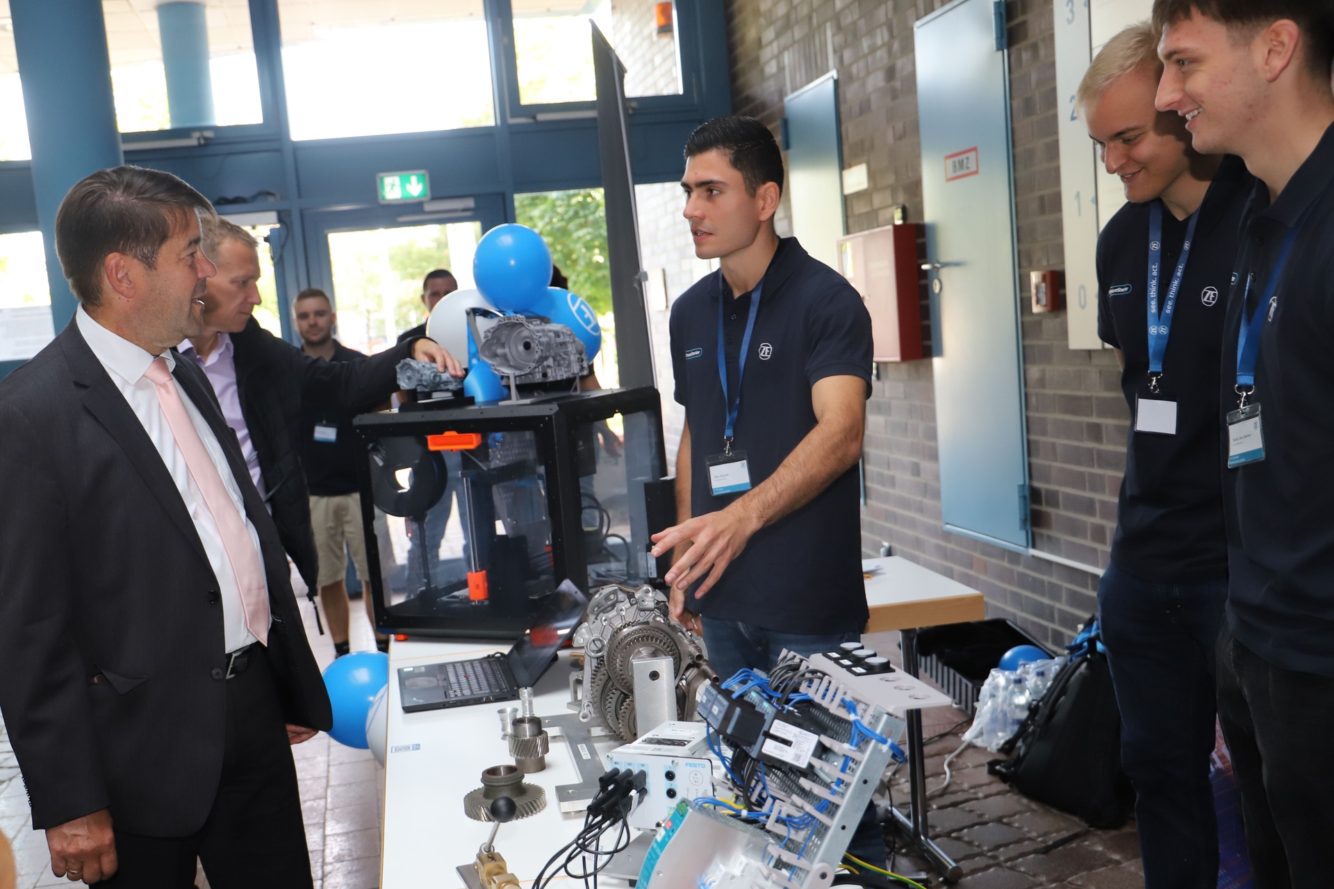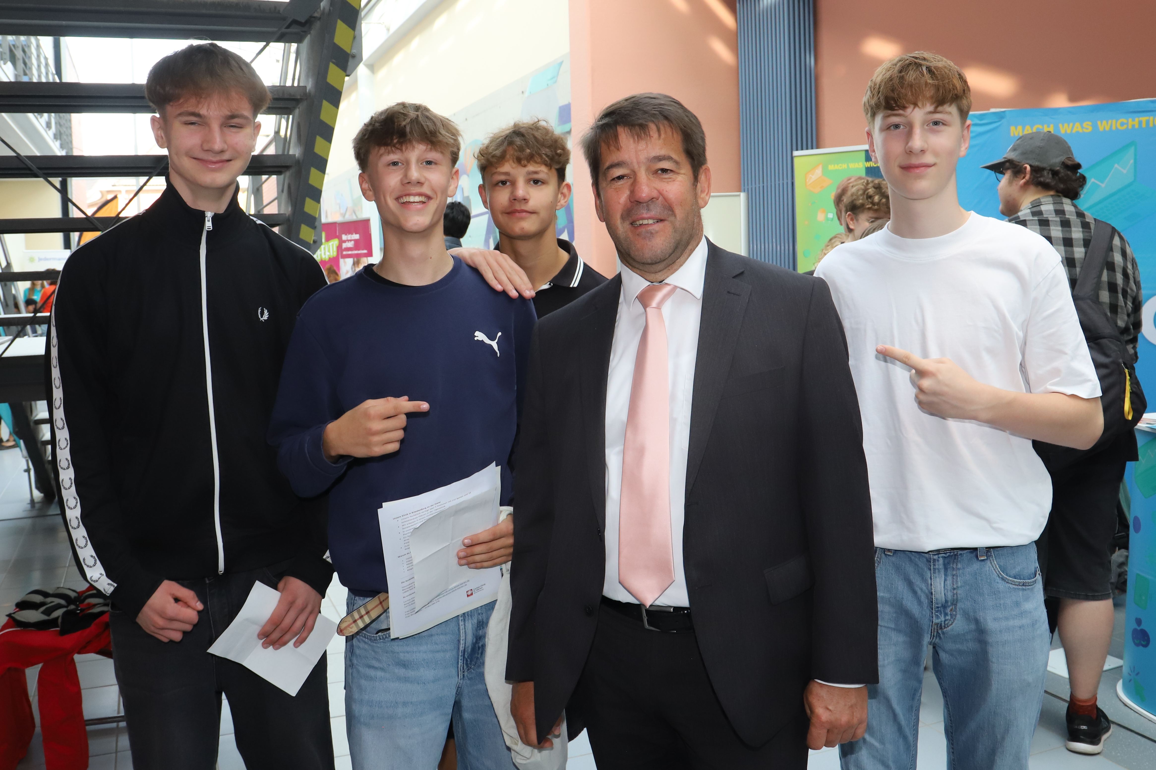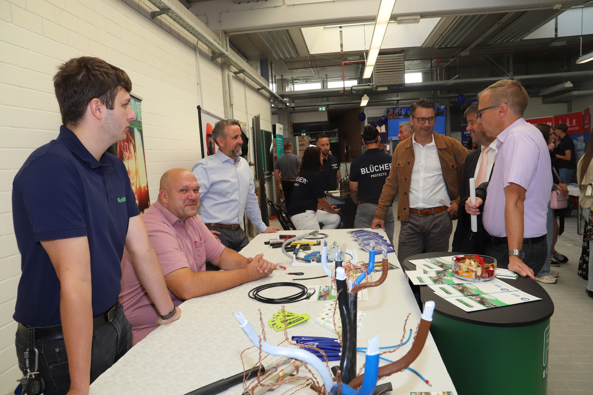 Im Anschluss besuchten die Vertreterinnen und Vertreter aus Politik und Verwaltung die Stände. Steffen Scheller ließ sich dabei nicht nur Berufe erklären, sondern probierte auch selbst aus: So erfuhr er bei Metallbau Windeck, wie Explosionszeichnungen funktionieren, und testete bei den Vermessern seine Schätzfähigkeiten zur Entfernungsmessung. Am Stand von ZF ließ er sich ein Getriebe erklären, das in einem Sportwagen zum Einsatz kommt. Interessante Einblicke zu Ausbildungsmöglichkeiten gewann er auch bei einer Steuerkanzlei und der Brandenburger Polizei.