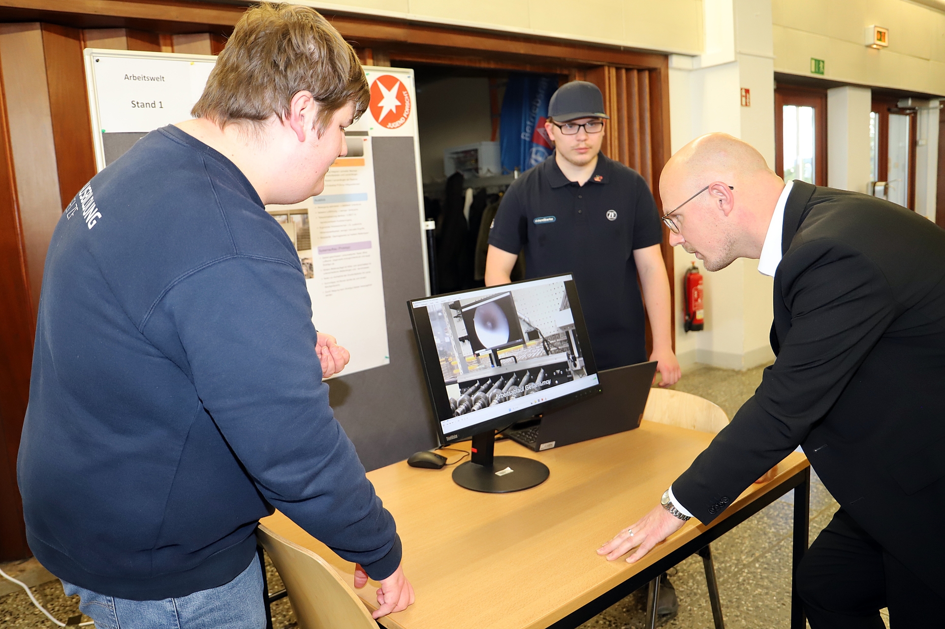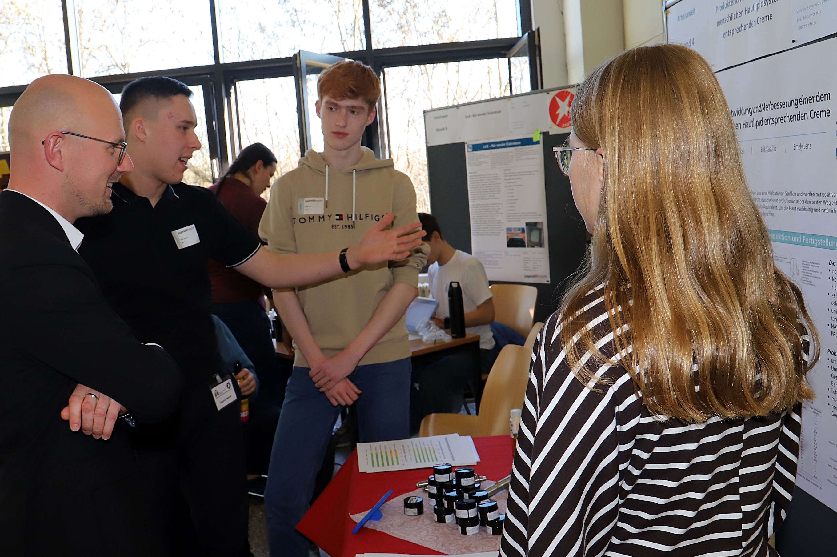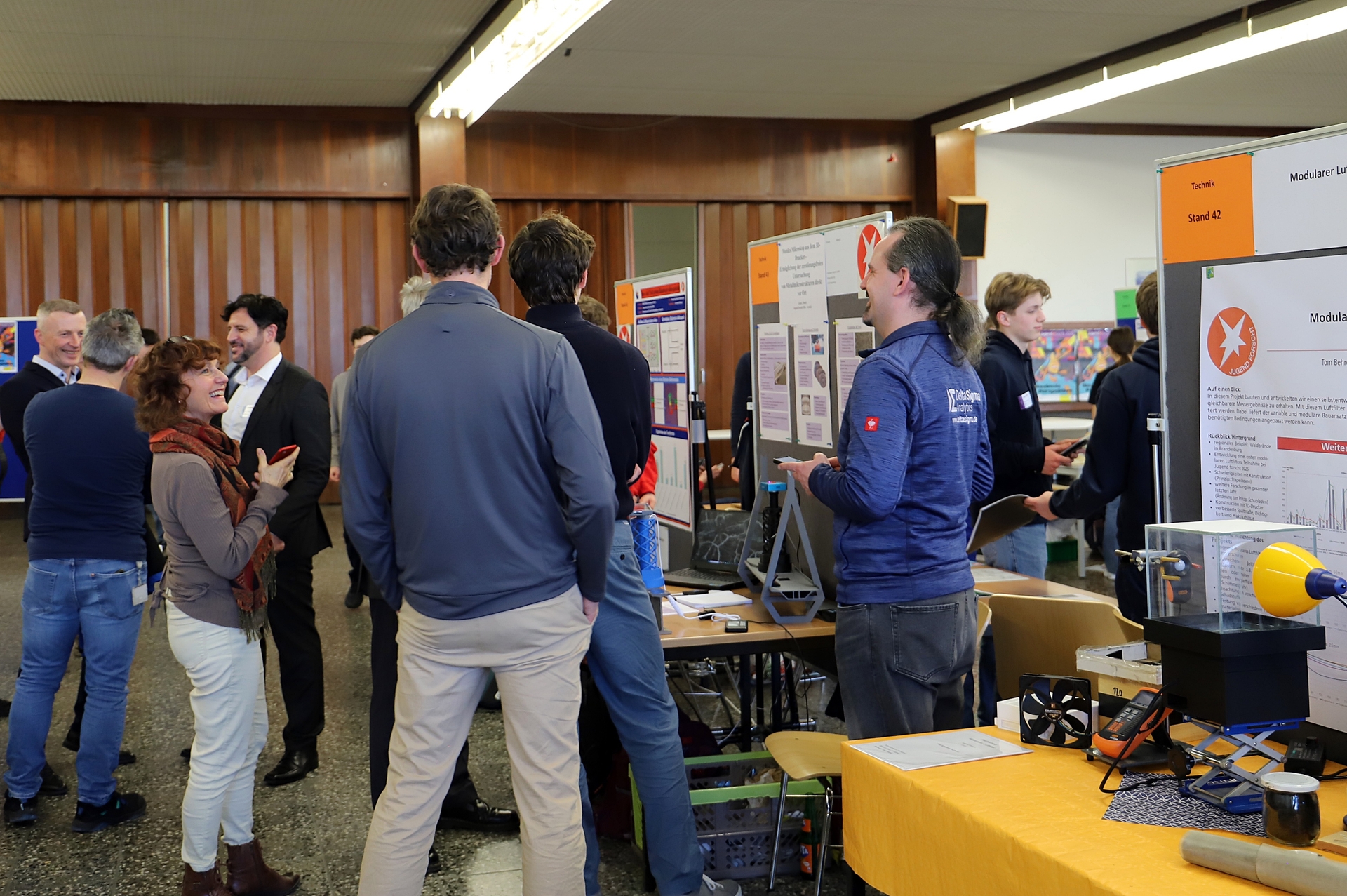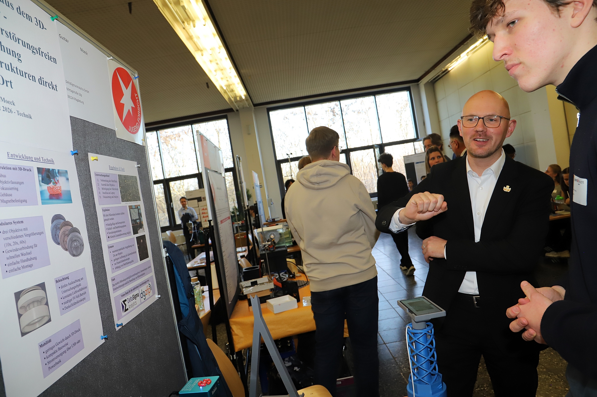 Beim Messerundgang informierten sich zahlreiche Gäste über die Projekte, darunter Oberbürgermeister Daniel Keip. Besonders interessierte ihn ein Projekt, bei dem mobile Mikroskope im 3D-Druck-Verfahren gefertigt wurden. Mit diesen Geräten können Brücken direkt vor Ort mikroskopisch untersucht werden. Die Kontaktdaten der Projektgruppe will er an die Bauverwaltung weiterleiten. Auch ein Wellenkraftwerk, ein Pumpspeicherwerk sowie ein Auswertungsprogramm für die Bewässerungssteuerung stießen auf sein Interesse. Zudem erklärte er sich bereit, als Proband für die Entwicklung einer neuen Creme mitzuwirken, die für alle Hauttypen geeignet sein soll.