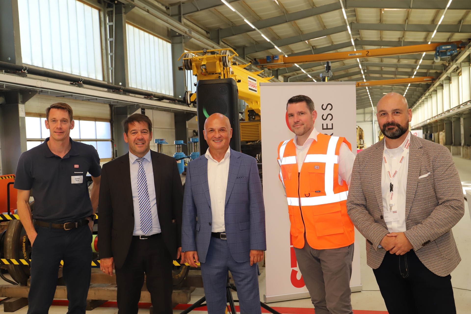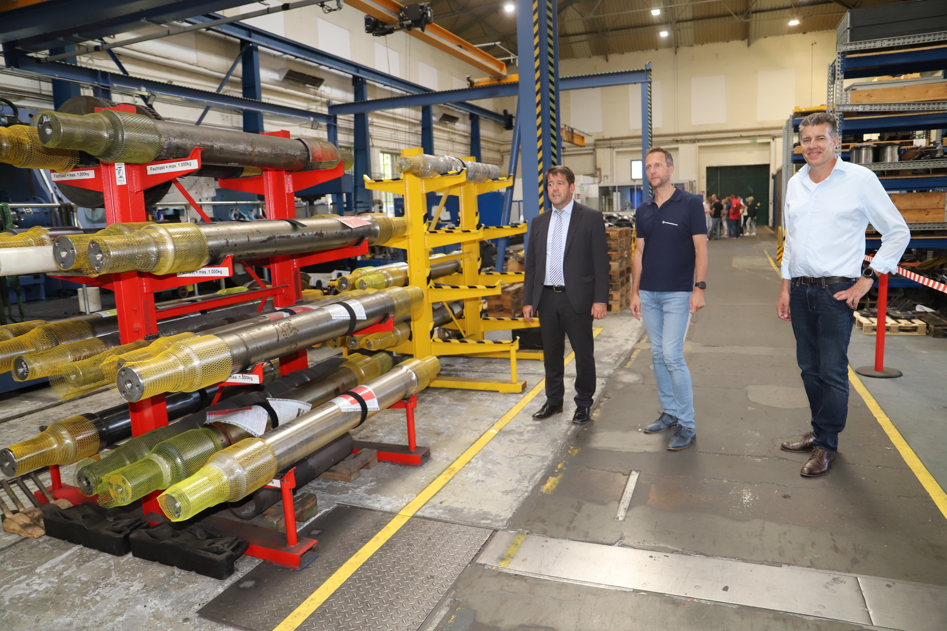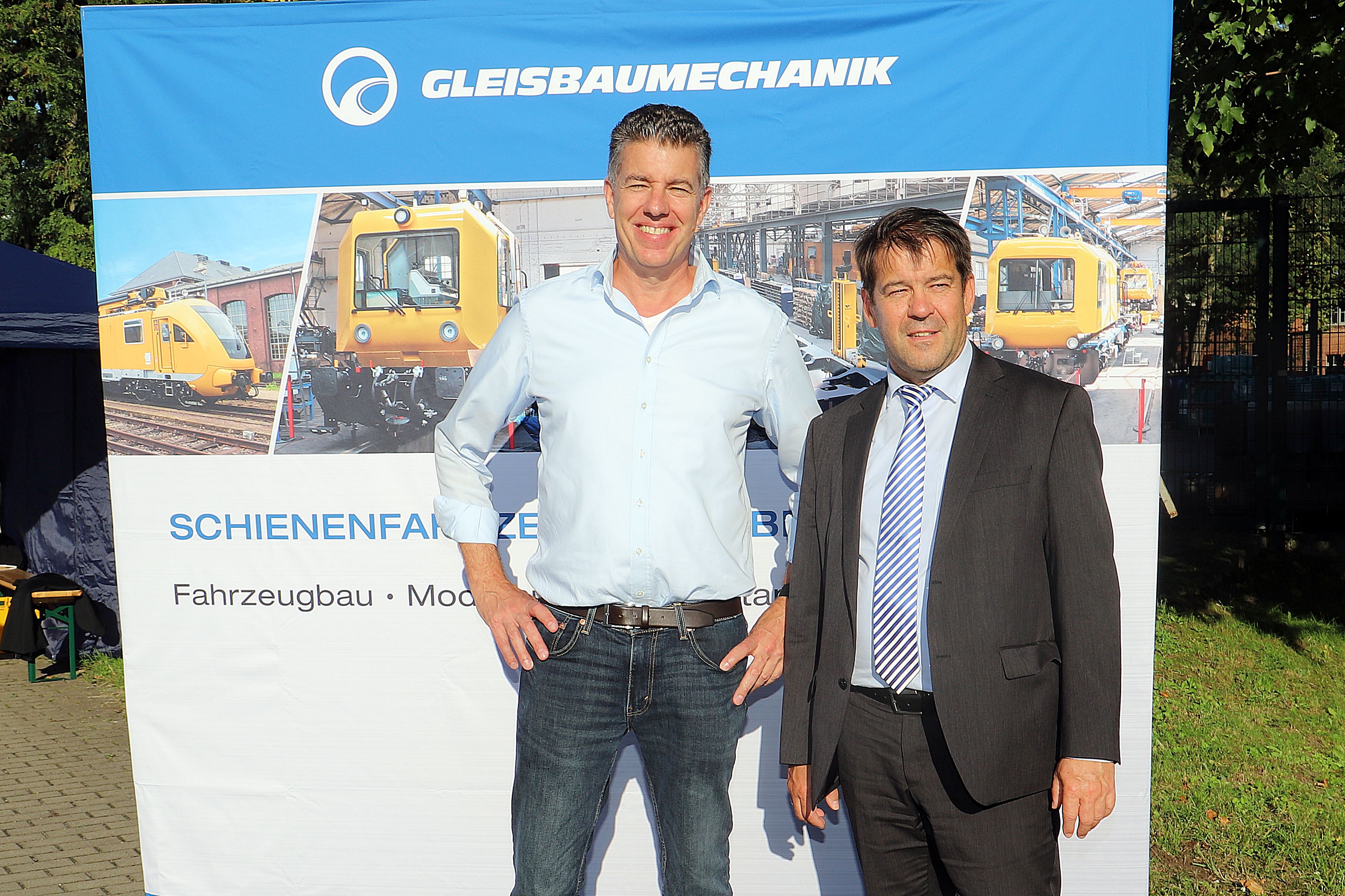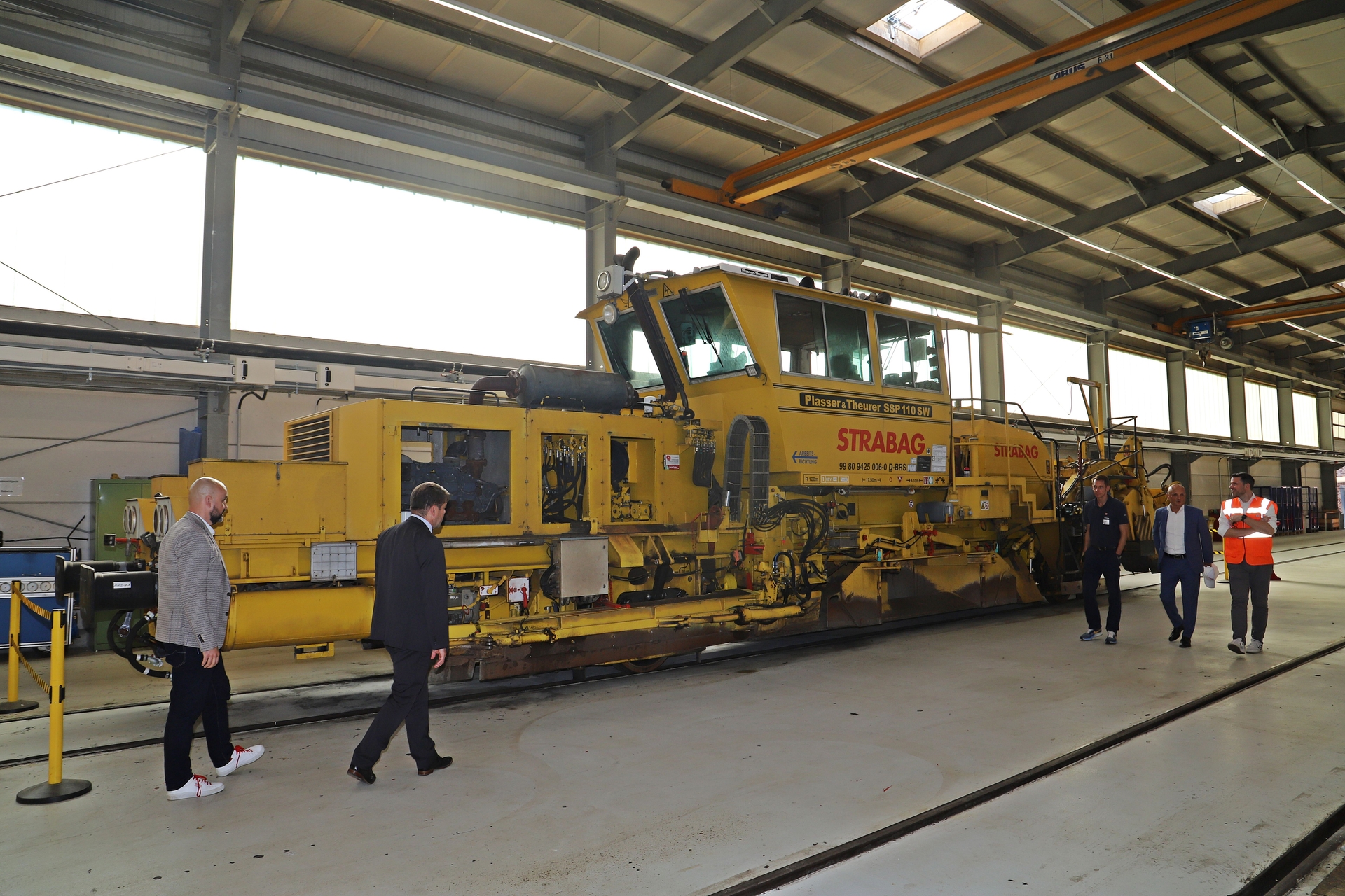 In der Gleisbaumechanik informierte sich der Oberbürgermeister bei Geschäftsführer Dr. Sven Teupke und seinem Führungsteam über die neuesten Entwicklungen und versprach Unterstützung bei der Elektrifizierung der Bahnstrecke vom Abzweig am Gleisdreieck bis zum Werksgelände.