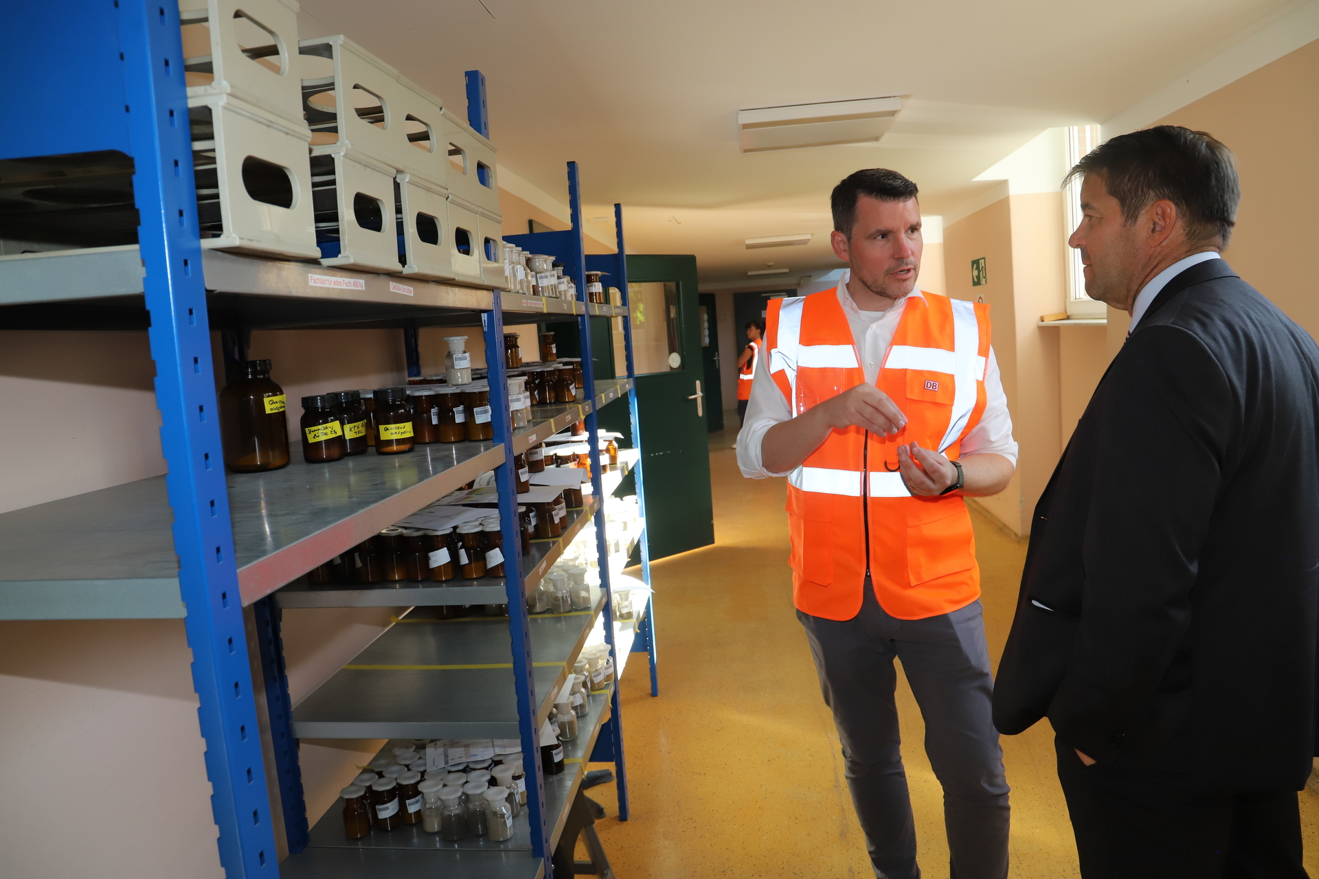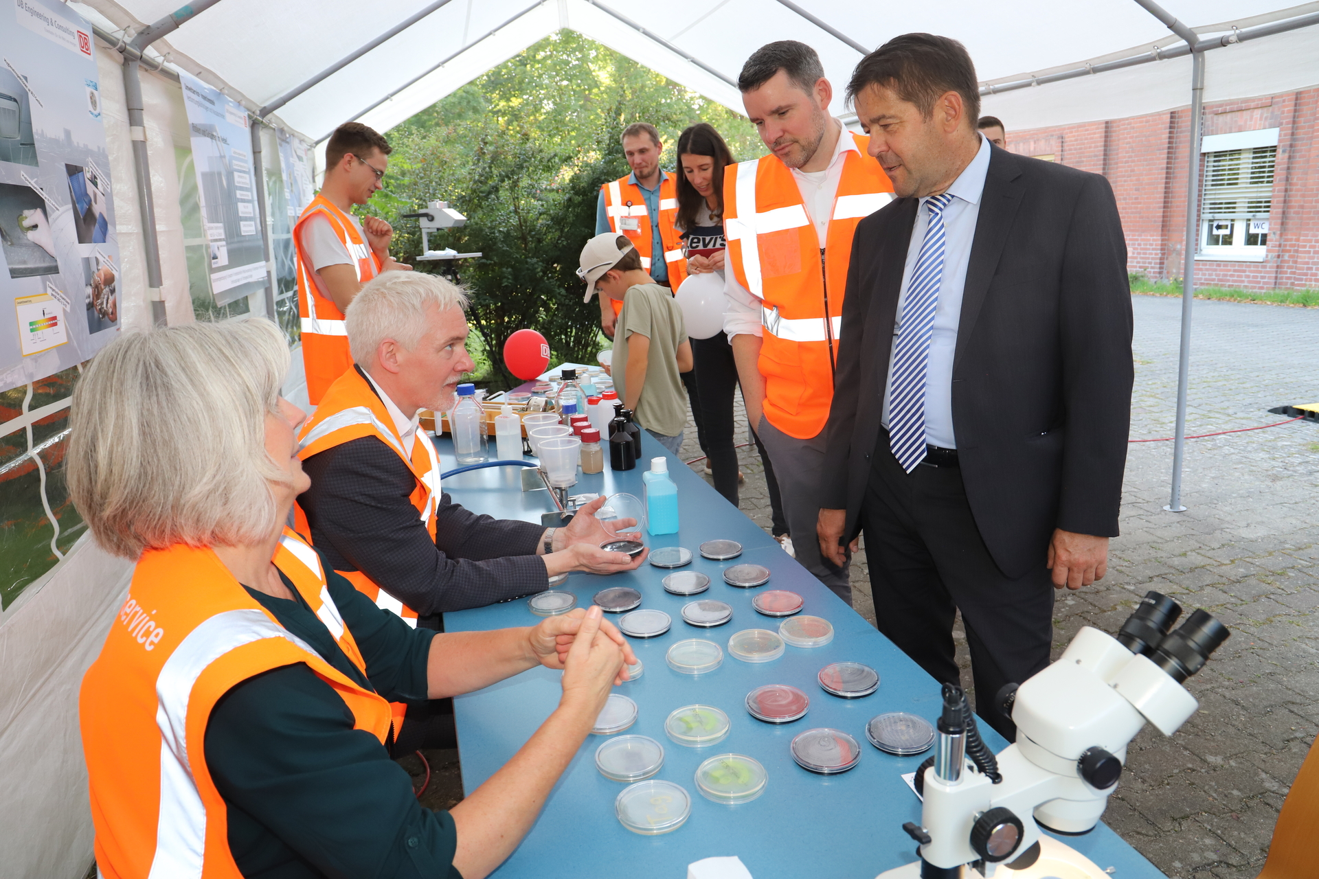 Bei der DB Systemtechnik erläuterte Standortleiter Dr. Jochen Kurz einen innovativen Rad-Schiene-Prüfstand. Beim Umweltservice der Deutschen Bahn informierte sich Steffen Scheller bei Standortleiter Philipp Tentrop und seinem Team über neueste Analyse-Methoden, bei denen unter anderem die Schadstoffbelastung von Schotter untersucht wird und über Methoden zur Hygieneuntersuchung bei der DB.