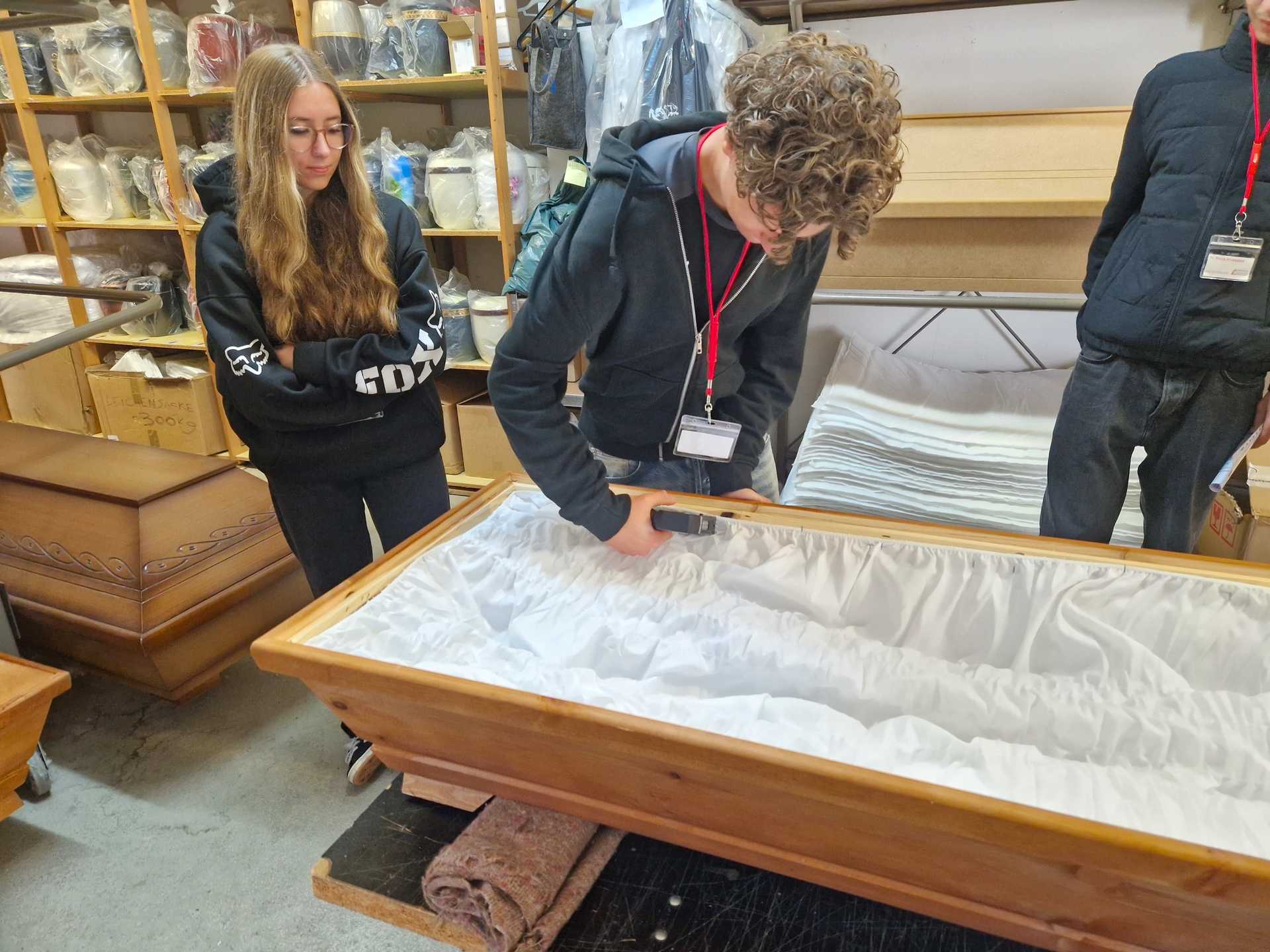 Wer wissen wollte, wie Software entsteht, war bei dotnet GmbH und Little Nerd Studio GmbH genau richtig: Hier galt es, eine Ameisenkolonie zu programmieren, die in einer virtuellen Welt überleben muss. Auch Berufe, die selten im Rampenlicht stehen, fanden großen Anklang: Beim Bestattungshaus Schnee GmbH erhielten Schülerinnen und Schüler einen sensiblen Einblick in die Abläufe „auf dem letzten Weg“, inklusive handwerklicher Aufgaben wie dem Innenausschlag eines Sarges.