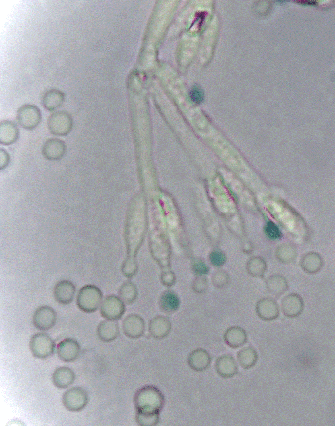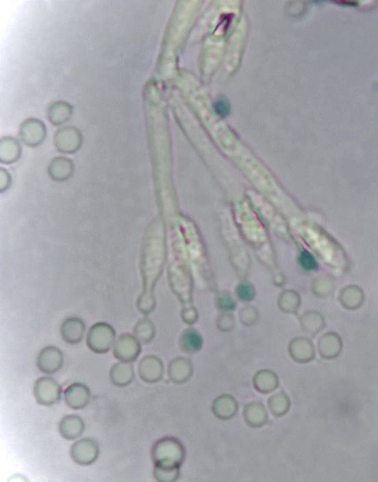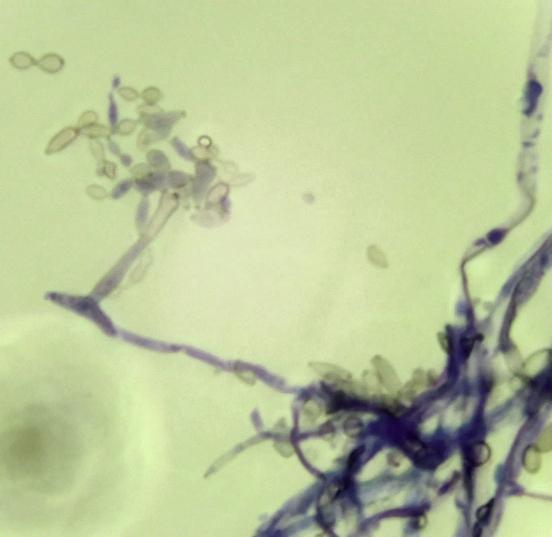 Ich habe zwei Bilder eines Schimmelschadens von der Oberfläche der Innendecke eines Gartenhauses mitgebracht. Dabei konnte ich als Befall zwei verschiedene Schimmelpilze identifizieren: In Bild 1 den Außenluftpilz Cladosporium sp. von einem Klebefilmpräparat der Oberfläche. In Bild 2 Penicillium corylophilum, der nach Wattestäbchenabstrich kultiviert und mikroskopiert wurde. Penicillium corylophilum wächst auf fettigen und öligen Substanzen und ist ein Hinweis auf eine mögliche Schadensursache, den öligen Innenanstrich.